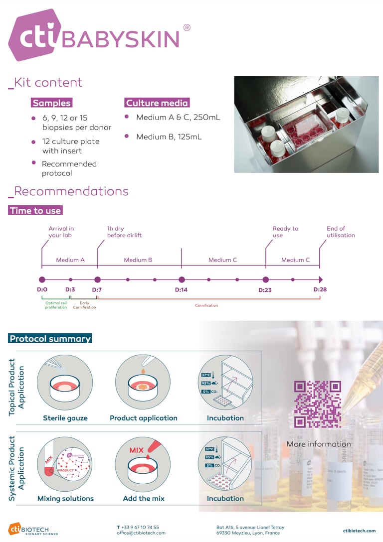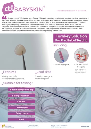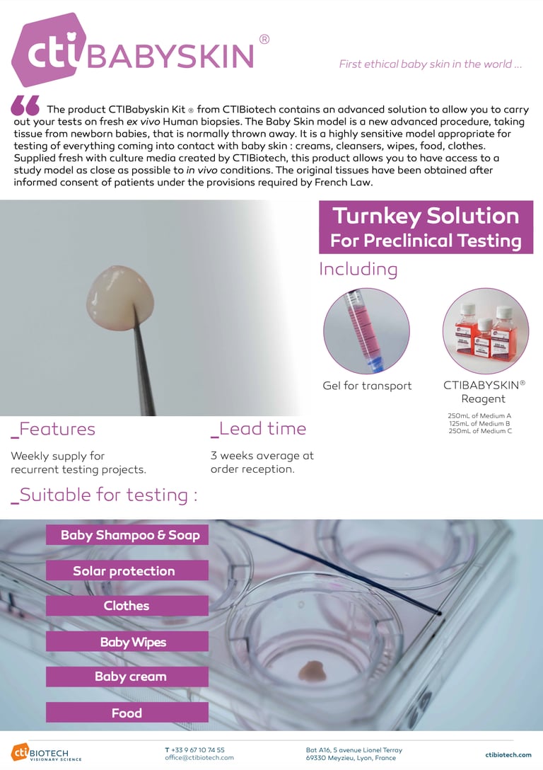 With this belief in mind, CTIBiotech proudly introduces CTIBabySkin®, a model developed from umbilical cord tissues.